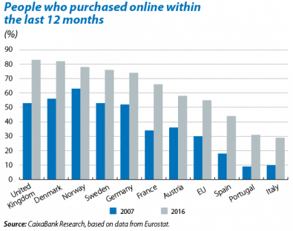 Online shopping has also become very popular in Europe. In 2016, 55% of Europeans bought online compared with 30% in 2007. In some EU countries e-commerce is even more widespread (see the first chart). For instance, over 70% of people shop online in the United Kingdom, Scandinavia and Germany. In other countries, such as Spain, the percentage is below the European average2 although the trend is clearly upward and growth is generalised across age groups (see the second chart).3 Since younger generations (16-44 years) are the most «digitalised», we are likely to see exponential growth in e-commerce in the future.
