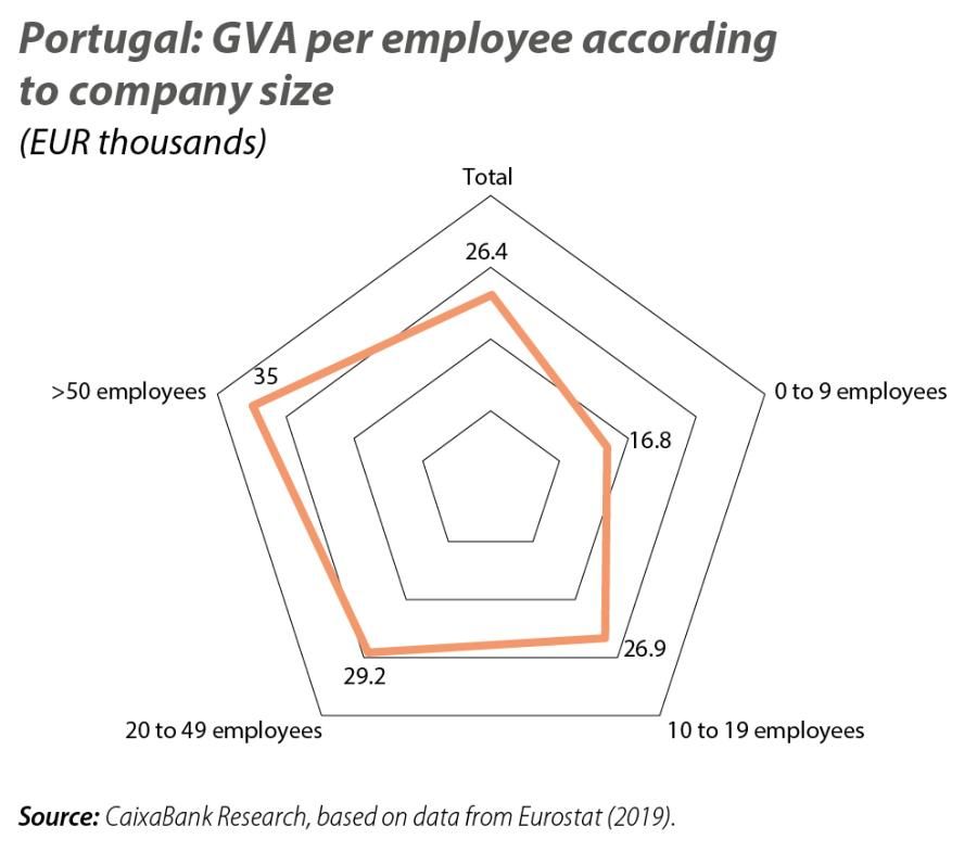 On the other hand, a key aspect of productivity is the size of companies. In Portugal, the productivity level of large companies is more than twice that of micro-enterprises. Several studies highlight that large companies are more likely to invest in intangible assets and highlight this investment as a catalyst for productivity growth.2 In fact, there are several aspects which help to boost productivity and which, due to their «intangible» nature, often appear as intermediate costs rather than investment: management and organisational efficiency models, marketing, brand value, databases, specific internally-developed training or software are examples of this. In highly developed economies that are close to the technological frontier, these aspects are even more critical to productivity growth. So, when we talk about the future of productivity in Portugal, we must also look at other aspects that enable companies to succeed in this context and observe new indicators. Some examples in this regard include the percentage of GDP that is allocated to research and development (particularly in the private sector), the percentage of business turnover that is used for CAPEX in intangible assets, human resources related to R&D per million inhabitants and the proportion of these resources that is allocated to the private sector, patent registrations, etc.