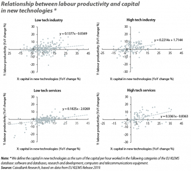 Clàudia Canals and Oriol Carreras1. We define labour productivity as the gross value added per hour worked. We define the degree of penetration of new technologies as the stock of capital per hour worked in software and databases, research and development, computers and telecommunications equipment (according to EU KLEMS). As discussed in the second article, this is a broad approximation for new technologies.