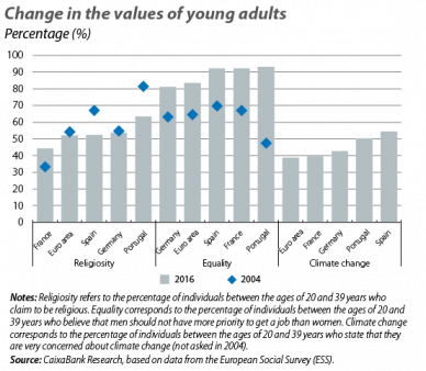 In addition, the current generation of young adults has a very different set of values from their parents (see third chart). Both Spain and Portugal are much more secular countries than just a few years ago. Religious sentiment has fallen markedly among young adults and to a far greater extent than in the rest of the euro area (which was already more secular). In addition, young people place more importance on values such as gender equality. For instance, more and more individuals believe that employment for men should not be given priority over employment for women, an opinion that was not so widespread a few years ago. Moreover, young adults are concerned about other issues such as climate change, particularly in Spain and Portugal.