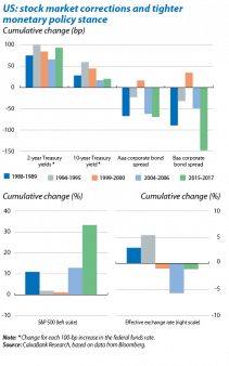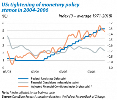 In short, in the previous four cycles, a close relationship can be seen between the trend in the Fed’s monetary policy stance and financial conditions. In contrast, the current cycle has three substantial differences in monetary policy terms that help to explain the decoupling observed. Firstly, the unconventional measures implemented by central banks, particularly asset purchases, promoted a low interest rate environment over a long period of time. Given that the Fed is reducing its balance sheet very gradually (while central banks from other regions, such as Europe and Japan, are still enlarging theirs), these measures are still having a significant effect. Secondly, the Fed is using a much more predictable and gradual strategy to tighten its monetary policy stance than in previous cycles. And, thirdly, the recent stock market corrections and consequent increase in the NFCI and ANFCI occurred precisely because investors more readily believed the strategy announced by the Fed and started to raise their interest rate expectations accordingly. From now on, this readjustment in expectations and the Fed’s reduction of its balance sheet should help any increases in the fed funds rate to be passed on more readily to financial conditions.