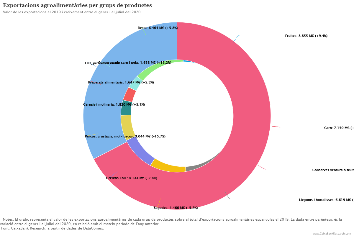 Pel que fa a les fruites, els cítrics (taric 0805) i els albercocs, les cireres, els préssecs, les prunes i els aranyons (taric 0809) mostren un vigor elevat (el +18,2% i el +17,2% interanual fins al juliol, respectivament). Els llegums i les hortalisses, que van representar el 13,1% del total d’exportacions agroalimentàries el 2019, mostren un avanç una mica més modest durant els set primers mesos del 2020 (el 4,3%), però alguns productes com les pastanagues, els cogombres i les cols presenten avanços molt significatius. D’altra banda, alguns grups de productes han registrat reculades, com, per exemple, el del peix, crustacis i mol·luscos (el –15,7%), les begudes (el –5,2%) i els greixos (el –5,4%). En particular, les exportacions d’oli d'oliva han caigut el 7,4% interanual, i les de vi, el 5,4%, tot i que els dos productes es mantenen en el top 5 dels productes agroalimentaris exportats.