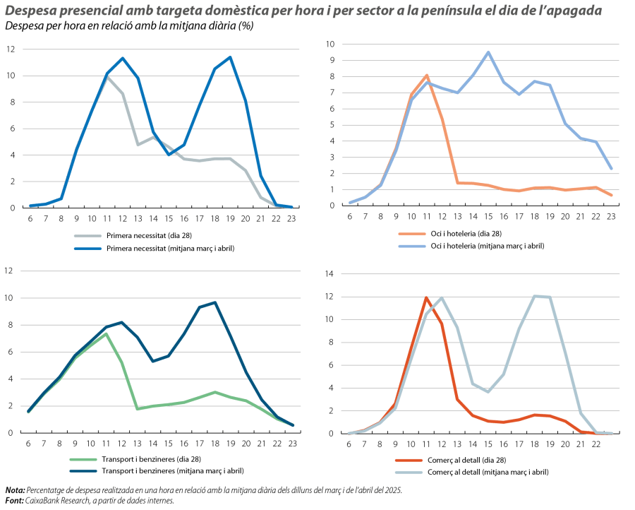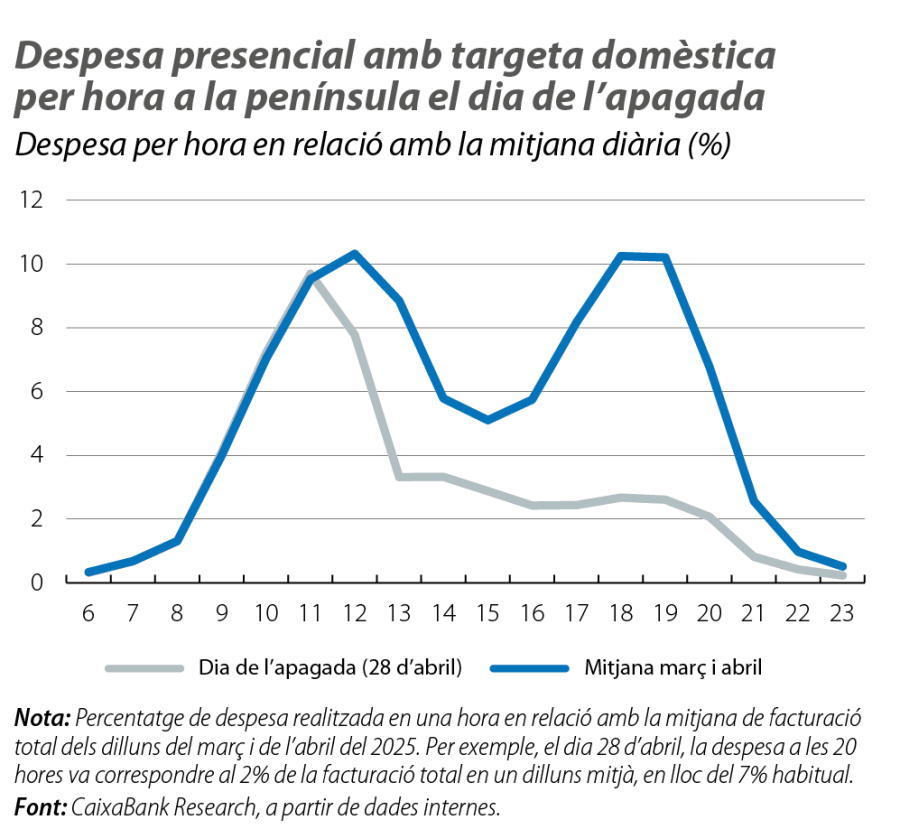 L’anàlisi de les dades de CaixaBank revela que l’apagada del 28 d’abril va provocar una caiguda del 34% en la despesa de consum de les llars espanyoles aquest dia, arran de la contracció del consum mitjançant els principals mètodes de pagament: presencial amb targeta, reintegraments i electrònic.1 No obstant això, en els dies posteriors, es va observar un efecte rebot significatiu: la despesa es va incrementar per damunt dels nivells habituals, la qual cosa suggereix que una part del consum es va desplaçar als dies següents.2 En conjunt, estimem que més de la meitat de la despesa no realitzada el dia de l’apagada va ser recuperada en els dos dies següents, la qual cosa va reduir l’impacte net a una caiguda del 15% de la despesa esperada per a aquest dilluns. Aquesta xifra és el resultat de la comparació de l’evolució de la despesa presencial amb targetes, de les retirades d’efectiu i del consum online del dia de l’apagada i dels dies posteriors amb el patró de despesa habitual dels dilluns i amb la despesa observada a les zones en què no es van produir talls d’electricitat.