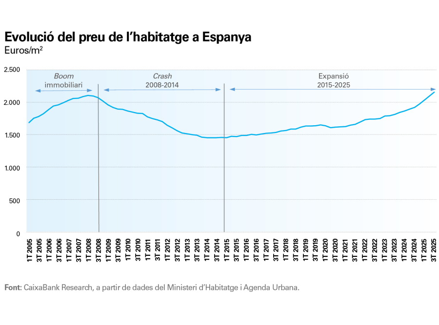 En els 20 últims anys, les dinàmiques de nivell i de dispersió dels preus del mercat immobiliari espanyol permeten distingir tres fases clau: