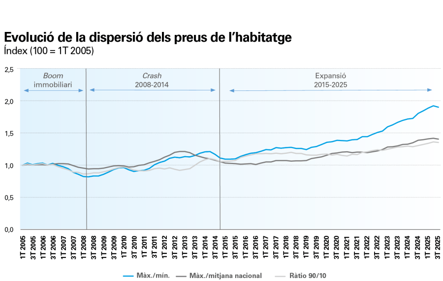 Aquest patró actual d’augment continuat de la dispersió dels preus es constata en diferents mètriques, com, per exemple, (i) la ràtio entre el municipi (>25.000 habitants) amb el preu més alt i el municipi amb el preu més baix; (ii) el quocient entre el municipi més car i la mitjana nacional, i (iii) el quocient entre el percentil 90 i el percentil 10. Totes aquestes mètriques descriuen el mateix perfil: reducció de la dispersió durant el boom immobiliari, augment durant el crash del 2008-2014 i fort increment de la dispersió durant l’expansió que va començar el 2015.