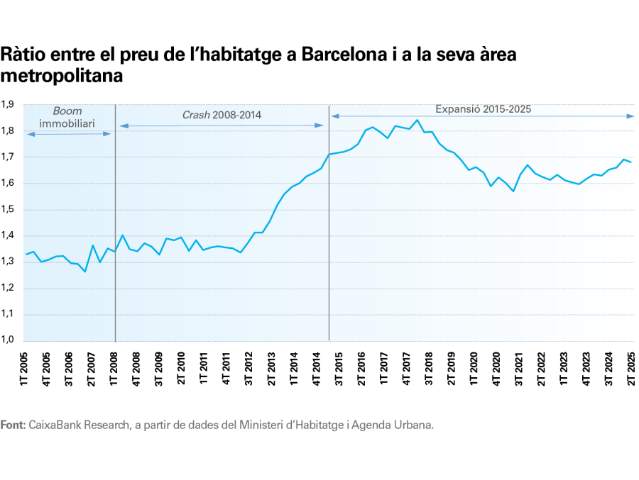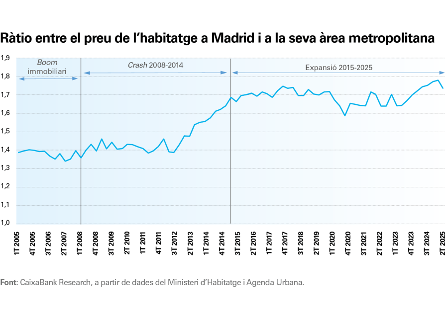 En el cicle alcista actual, el patró general es manté, tot i que amb matisos rellevants. Durant la pandèmia, les caigudes als centres de les àrees metropolitanes van ser més ràpides i intenses, la qual cosa reflectia un xoc temporal sobre les preferències residencials i sobre la mobilitat. No obstant això, des del començament del 2024, els preus a Barcelona i a Madrid han tornat a créixer més de pressa que a les respectives àrees metropolitanes. I, malgrat que, en els dos últims trimestres, el creixement de l’àmbit metropolità s’ha aproximat al dels centres, els preus a les grans ciutats es mantenen, des d’una perspectiva històrica, molt per damunt dels de les seves àrees metropolitanes. Això pot suggerir que, en els propers anys, la pressió sobre els preus podria ser més intensa als municipis de les corones metropolitanes.