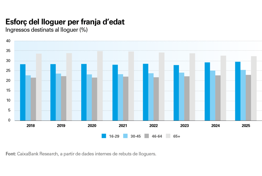 Quan es descompon l’esforç del lloguer per edats, s’observa una marcada heterogeneïtat i dinàmiques diferenciades en funció del cicle vital.