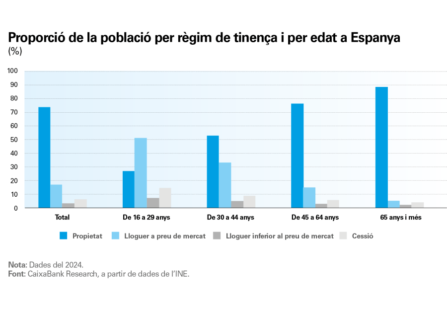 L’augment de l’esforç per a la població jove és particularment rellevant, ja que el règim de tinença està estretament vinculat al moment del cicle vital. La població més jove tendeix a llogar (o a residir en habitatges cedits), mentre que, a mesura que augmenta l’edat, creix amb força la proporció de propietaris, fins a situar-se prop del 90% entre les persones més grans de 65 anys.