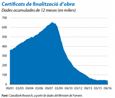 Sembla que al sector li costa adaptar-se al nou entorn de creixement econòmic, i així ho evidencien les certificacions de finalització d’obra, que, al setembre, continuaven registrant una taxa de creixement negativa, en concret del –13% interanual en l’acumulat de 12 mesos. Aquestes dades no són encoratjadores, però cal tenir en compte que la construcció d’una edificació és un procés llarg, de manera que el nombre d’habitatges acabats a dia d’avui reflecteix les expectatives que tenia el sector al final del 2014, moment en què els preus van tocar fons.