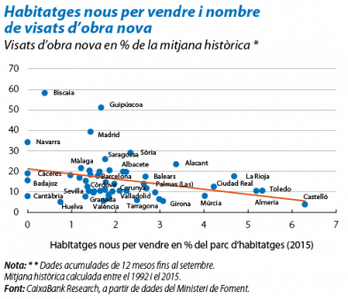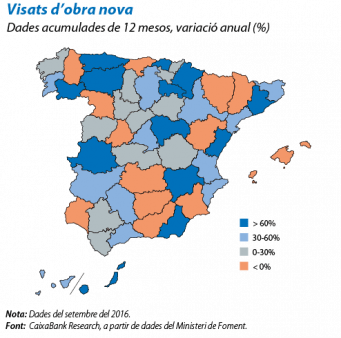 Les xifres de visats d’obra nova ofereixen una visió molt més dinàmica. Malgrat que el nombre d’habitatges iniciats es manté en nivells molt baixos, la taxa de creixement és molt vigorosa des de fa mesos. En concret, al setembre, el ritme d’avanç va assolir el 40% interanual a Espanya (acumulat de 12 mesos). La millora de les condicions financeres i la recuperació de l’activitat econòmica afavoreixen la recuperació de l’activitat immobiliària a tot el territori, però cal destacar que aquest fort ritme d’ascens és molt dispar entre regions: al setembre del 2016, els visats d’obra nova van créixer per damunt del 60% interanual a 13 províncies i van recular a 13.2