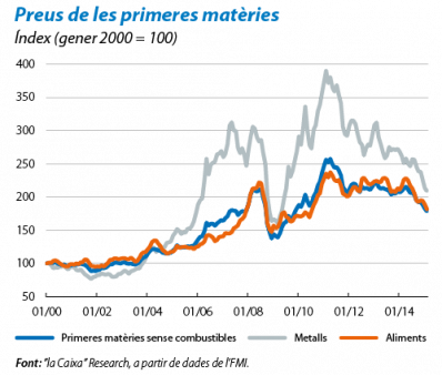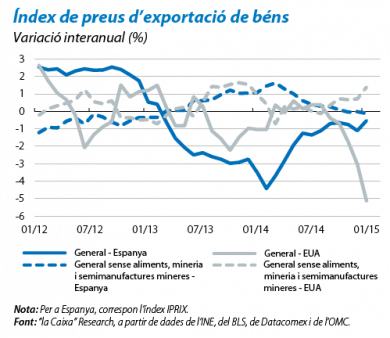 En un entorn en què l'economia espanyola guanya competitivitat, és lògic que el creixement del preu de les exportacions sigui menor, ja que, probablement, reflecteix un esforç de contenció de costos i de compressió de marges per part de les empreses exportadores. Així i tot, aquesta tendència s'ha intensificat en els últims trimestres. El preu de les exportacions acumula una reculada del 4,4% des del juny del 2012. Aquesta intensificació ha estat motivada, en gran part, per la forta reculada del preu dels minerals (en especial els metàl·lics), dels productes elaborats a partir d'aquests minerals i dels aliments. En concret, el preu de les exportacions del sector d'extracció de minerals metàl·lics ha disminuït gairebé el 20%, i el dels productes elaborats a partir d'aquests minerals, el 7%. Es tracta d'uns descensos importants, tenint en compte que els dos sectors representen, en conjunt, el 13% de les exportacions espanyoles de béns. En la mateixa línia, destaca la reculada recent del preu dels aliments elaborats (del 3,2% interanual al gener del 2015), que representen, també, al voltant del 14% de les exportacions espanyoles de béns.