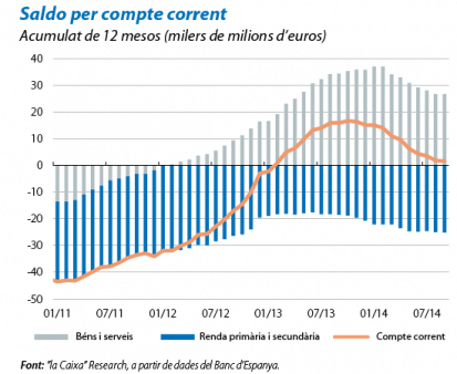 Un dels èxits més importants de l'economia espanyola durant la crisi ha estat la correcció d'un dels seus principals desequilibris macroeconòmics: el dèficit exterior. Mentre que, el 2008, el dèficit per compte corrent representava el 10% del PIB, el 2013, va anotar un modest superàvit, de l'1,4% del PIB, el primer en 25 anys.1 No obstant això, durant l'any 2014, s'ha tornat a produir un deteriorament del compte corrent. Així, el saldo per compte corrent acumula un dèficit de 4.200 milions entre el gener i el setembre, la qual cosa contrasta amb el superàvit de 9.300 milions del mateix període del 2013. Aquesta situació ha fet saltar les alarmes: sembla que l'economia espanyola no pugui (o no sàpiga) créixer sense acumular dèficits externs. No obstant això, una anàlisi més detallada ens permet matisar aquesta conclusió, una qüestió que, atesa l'elevada posició deutora neta de l'economia espanyola en relació amb l'exterior, és de la màxima rellevància.