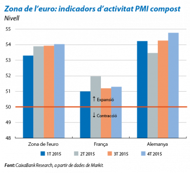 La recuperació prossegueix amb un avanç moderat però sostingut. El ritme d'expansió de l'economia de la zona de l'euro es manté, amb el suport del bon comportament de la demanda domèstica. Malgrat que el BCE va assenyalar l'augment dels riscos exteriors en la decisió d'ampliar el QE, les perspectives per a l'economia europea són positives i avancen segons el que s'esperava. Així ho indiquen les previsions del BCE, que amb prou feines va variar l'escenari de creixement i d'inflació al desembre. D'aquesta manera, espera que l'avanç de l'economia passi de l'1,5% el 2015 a l'1,9% el 2017. La feblesa de la inflació el 2015 és deguda, en gran part, a la caiguda dels preus del component energètic, un factor que deixarà d'actuar a mitjà termini. En els pròxims mesos, esperem que l'economia es beneficiï encara del baix preu del petroli, així com de la política monetària acomodatícia, d'un tipus de canvi favorable per a les exportacions i d'una menor consolidació fiscal. No obstant això, són factors conjunturals, i, per tant, és necessari continuar aprofundint en les reformes estructurals, tant a cada país com al conjunt de la zona de l'euro (unió econòmica, fiscal, bancària i política), que puguin garantir el creixement sostingut a llarg termini.