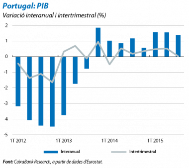 La incertesa política plana sobre la recuperació a Portugal. La bona dinàmica de l'activitat s'ha enterbolit en els últims mesos. L'economia lusitana va continuar creixent en el 3T en relació amb l'any anterior (1,4% interanual), però es va estancar en relació amb el 2T (0,0% intertrimestral). Per components, en termes intertrimestrals, el consum públic i la inversió van disminuir i van ser compensats pel consum privat i pel sector exterior. No obstant això, la contribució positiva del sector exterior amaga una reducció de l'activitat, ja que respon a una major caiguda de les importacions (–3,0%) que de les exportacions (–2,1%). Aquestes dades s'emmarquen en un context d'incertesa política, amb un parlament fragmentat després de les eleccions del 4 d'octubre, que, finalment, ha dut el Govern a una coalició dels socialistes, del Partit Comunista i del Bloc d'Esquerres. Hi ha dubtes sobre la voluntat reformadora del nou Executiu, i les eleccions presidencials del 24 de gener seran la següent prova política. Però l'elevat nivell de deute públic (129% del PIB) i una taxa d'atur del 12,4% evidencien la necessitat que el país continuï implementant reformes. A més a més, els estrets vincles amb el Brasil i amb Angola, que han estat una font de creixement en els últims anys, poden ser ara un factor de risc per la recessió que experimenten aquests països.