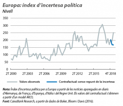 Finalment, és probable que la incertesa política continuï sent elevada, i els repunts no són descartables si es produeixen sorpreses en les eleccions europees i en el brexit o si es revifen altres fronts de tensió, com la política fiscal italiana. Així i tot, una dada esperançadora és que, en el 1T 2019, un període complicat sobre el qual va planar l’amenaça d’un brexit caòtic, l’índex d’incertesa política d’Europa va disminuir en 24 punts en relació amb el 4T 2018, gràcies, principalment, a les millores a França i a Itàlia.