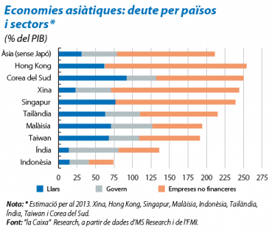 No obstant això, la situació és heterogènia entre països. La nota relativament positiva és que els registres més elevats, pel que fa al nivell de deute i a la seva evolució recent, es concentren en les economies «fortes» de la regió: la Xina, Hong Kong, Singapur i Corea del Sud. En canvi, les economies considerades més «febles» –l'Índia i Indonèsia– tenen un endeutament més moderat, fins i tot considerant la seva menor renda per capita. Així, tot i que l'Índia arrossega el deute públic més elevat de la regió (el 67% del PIB), una inflació alta i unes reformes estructurals pendents, és tranquil·litzador observar que el total del seu deute (empreses, llars i Govern) es va quedar en el 136% del PIB el 2013, sensiblement per sota de la mitjana de la regió i només 7 punts per damunt del nivell del 2007. Per la seva banda, Indonèsia va registrar un deute total del 74% el 2013, el més baix del grup de països analitzats. El factor demogràfic també juga al seu favor, ja que l'Índia i Indonèsia defugen la tendència general d'envelliment de la població predominant a la regió. Les xifres que criden més l'atenció corresponen a la Xina, on el deute total va passar del 148% al 244% del PIB (del 97% al 173% en el cas de les empreses no financeres). El risc que això comporta s'ha d'avaluar en el marc del procés de reequilibri i transformació de l'economia xinesa i de les peculiars regles de funcionament d'un sistema dominat per l'Estat. Hong Kong, Singapur i Corea també presenten un deute elevat, però en el context d'una renda per capita molt superior i d'un sistema financer més desenvolupat. En tot cas, cal no oblidar les fortaleses inherents de la regió, que es concreten en un potencial elevat de creixement. A més a més, globalment els Governs i les llars mantenen un nivell d'endeutament relativament contingut.