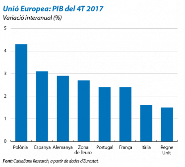 Es constata el bon momentum de la zona de l’euro del final de l’any. Tal com hem esmentat més amunt, les dades de creixement del PIB del 4T 2017 mostren una dinàmica favorable de creixement, amb una inèrcia que, pel que sembla, es traslladarà a la primera meitat del 2018. Per països, destaquen els avanços d’Alemaya i de França, que, en el 4T, van créixer el 2,9% i el 2,4% interanual, les taxes més elevades del 2017, quan van situar el còmput global de l’any en el 2,5% i en l’1,9%, respectivament. Fins i tot Itàlia, malgrat mantenir-se endarrerida en relació amb la resta de la zona de l’euro, va créixer l’1,6% interanual en el 4T i va situar el total de l’any en l’1,5%, el registre més alt des del 2010. Fora de la zona de l’euro, els països de l’est, amb un creixement interanual en el 4T del 4,8% a Hongria i del 4,3% a Polònia, van mantenir la fermesa mostrada en els trimestres anteriors. Per la seva banda, atès el context d’elevat creixement al conjunt de la UE, va destacar el pobre resultat del Regne Unit, on l’economia, que només va créixer l’1,5% interanual en el 4T, continua patint els efectes de l’impacte de la incertesa de les negociacions sobre el brexit.