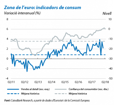 Bones perspectives per a la demanda. Els consumidors es continuen beneficiant d’una política monetària molt acomodatícia i d’un mercat laboral que continua generant ocupació i que ha reduït la taxa d’atur en 1,0 p. p. al llarg del 2017, fins a situar-se en el 8,7% al desembre. En aquest context, la confiança es manté elevada, la qual cosa afavoreix el creixement del consum privat. Una mostra d’això és el registre que va marcar l’índex de confiança del consumidor al febrer, quan es va situar en els 0,1 punts, 2,5 punts per damunt de la mitjana del 2017. Així mateix, les vendes al detall van créixer el 2,2% interanual al desembre, una taxa similar a la mitjana del 2017.