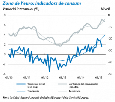La inflació es recupera. La major fortalesa del consum que s'observa de forma generalitzada a la zona de l'euro i la recuperació del preu del petroli han permès que la inflació sortís del terreny negatiu. Si tenim en compte l'evolució de la inflació al maig a Espanya i a Itàlia (tot i que no s'ha publicat la taxa per a la zona de l'euro ni per a la majoria de països), la inflació s'hauria de continuar recuperant. En concret, la taxa d'inflació harmonitzada va augmentar a Espanya en quatre dècimes, fins al –0,3%, i en tres dècimes a Itàlia, fins al 0,2%. Fins al final de l'any, s'espera que l'impuls del consum exerceixi una pressió alcista sobre els preus. A més a més, també s'evaporarà l'efecte base de la caiguda del preu del petroli dels últims mesos, la qual cosa farà incrementar la inflació. La depreciació de l'euro també pressionarà a l'alça els preus, ja que encarirà les importacions.