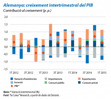 Un creixement del PIB més robust en el 1T 2015. L'economia va avançar el 0,4% del gener al març a la zona de l'euro, per damunt del 0,3% registrat en el 4T 2014. Per països, destaca el fort creixement d'Espanya, del 0,9% intertrimestral, i sorprèn a l'alça l'avanç del PIB a França, del 0,6% intertrimestral, amb un increment important del consum privat. No obstant això, l'elevada contribució de les existències sobre el creixement francès fa pensar que serà difícil que mantingui aquest ritme en el que queda d'any. La taxa a Alemanya, del 0,3% intertrimestral, va ser una mica inferior a la prevista, però la seva composició favorable (la demanda interna i les exportacions van continuar mostrant signes de fortalesa) evidencia que l'expansió és sòlida. D'altra banda, l'economia italiana va abandonar la recessió en què estava immersa des del 2008 (llevat de l'any 2010) i va presentar un avanç del PIB del 0,3% intertrimestral. De cara als pròxims mesos, s'espera que l'activitat econòmica continuï creixent a Itàlia a un ritme moderat.