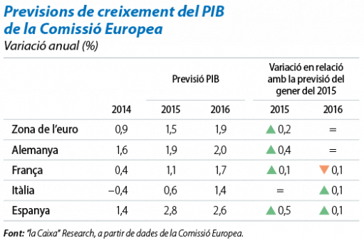 La Comissió Europea millora les previsions econòmiques per a la zona de l'euro. La Comissió Europea considera que la recuperació serà lleugerament més intensa del que s'havia anticipat uns mesos enrere, gràcies a l'embranzida de diversos factors temporals: la caiguda del preu del petroli, la depreciació de l'euro i el programa d'expansió monetària del Banc Central Europeu (BCE), que propicia que les condicions financeres siguin més favorables. Així i tot, l'impacte d'aquests factors variarà en funció dels països. Així, la revisió a l'alça de les previsions de creixement del 2015 va ser més intensa a Espanya (0,5 p. p.) i a Alemanya (0,4 p. p.) que a França (0,1 p. p.) i a Itàlia (sense canvis). La institució també va rebaixar les perspectives de creixement per a Grècia del 2,5% al 0,5% i va assenyalar la situació financera del país com un dels majors riscos per a la recuperació de la zona de l'euro. Dins el Semestre Europeu, la Comissió alerta de les febleses estructurals que acumulen molts països de la zona de l'euro i de la temporalitat dels factors positius que donen suport al creixement. Per enfortir l'economia dels diferents països de la Unió Europea, la Comissió s'ha compromès a disminuir, a partir d'ara, el nombre de recomanacions, malgrat que seran més específiques i que es farà una revisió més exhaustiva del grau de compliment. En aquesta línia, els informes per països han concretat les prioritats d'actuació: augmentar la competència del mercat de productes o de serveis (a Alemanya), flexibilitzar la legislació laboral (a França), consolidar la reducció del dèficit (a Espanya) o apuntalar les febleses del sector financer (a Itàlia).