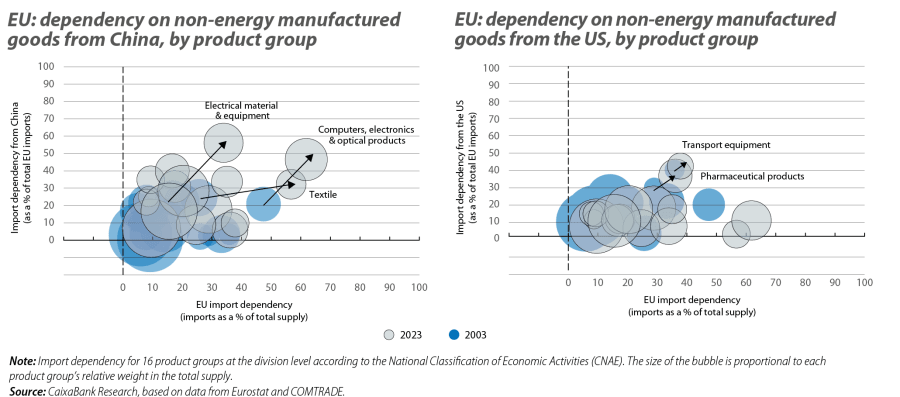 A l’escenari geopolític global, cada vegada més complex i fragmentat, la idea d’autonomia estratègica a la UE ha mutat des d’un pur concepte de seguretat i defensa a un més ampli, amb un elevat contingut econòmic.1 La lògica és senzilla: més capacitats productives pròpies donen més graus de llibertat en la política internacional. Posar fi a la dependència de l’energia russa n’és un bon exemple (vegeu «El difícil adeu de la UE a l’energia russa», en aquest mateix Informe Mensual). També ho són les actuals negociacions comercials amb els EUA. Amb l’amenaça d’un aranzel del 20% anunciat per Trump el 2 d’abril i d’una possible escalada proteccionista en sectors clau, com l’automoció o la indústria farmacèutica, la UE ha adoptat un perfil contingut en les seves respostes2 i ha mantingut una retòrica menys dura amb la Xina (de-risking enfront de de-coupling).3 Pot ser un posicionament estratègic, però cap d’aquestes decisions és difícil d’entendre si tenim en compte les dependències importadores acumulades des de l’inici del segle, des de minerals crítics a inputs intermedis i productes finals.4 Aquí centrem l’atenció en el sector de les manufactures, amb l’exclusió de la branca d’energia.