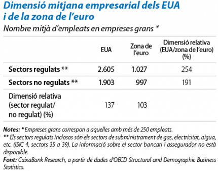 Així mateix, és important remarcar que és, precisament, als sectors regulats on les economies d'escala solen ser majors. Per tant, els beneficis potencials d'ampliar la dimensió del mercat (o els costos de no fer-ho) són especialment rellevants per a les empreses d'aquests sectors. Així, als EUA, les empreses de més de 250 empleats són més grans als sectors regulats que als no regulats. En canvi, a Europa, no hi ha diferències significatives de dimensió empresarial entre sectors (vegeu la taula).