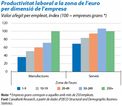 La preocupació per l'elevada atomització del teixit empresarial europeu no és intranscendent, ja que dimensió empresarial i productivitat solen anar sempre de la mà. El gràfic adjunt ofereix una bona mostra d'això: la productivitat laboral en empreses de més de 250 empleats és molt més elevada que la de les empreses més petites. És interessant notar que el diferencial de productivitat entre empreses de diferent dimensió és més gran al sector manufacturer que al dels serveis. Probablement, això és degut a la major necessitat d'inversió en actius fixos del sector manufacturer. Finalment, per il·lustrar la importància de l'estructura empresarial sobre la productivitat, serveixi de referència que, si la zona de l'euro tingués una distribució de la dimensió empresarial igual a la nord-americana, la productivitat laboral mitjana de la zona de l'euro seria el 14% més elevada que l'actual.1