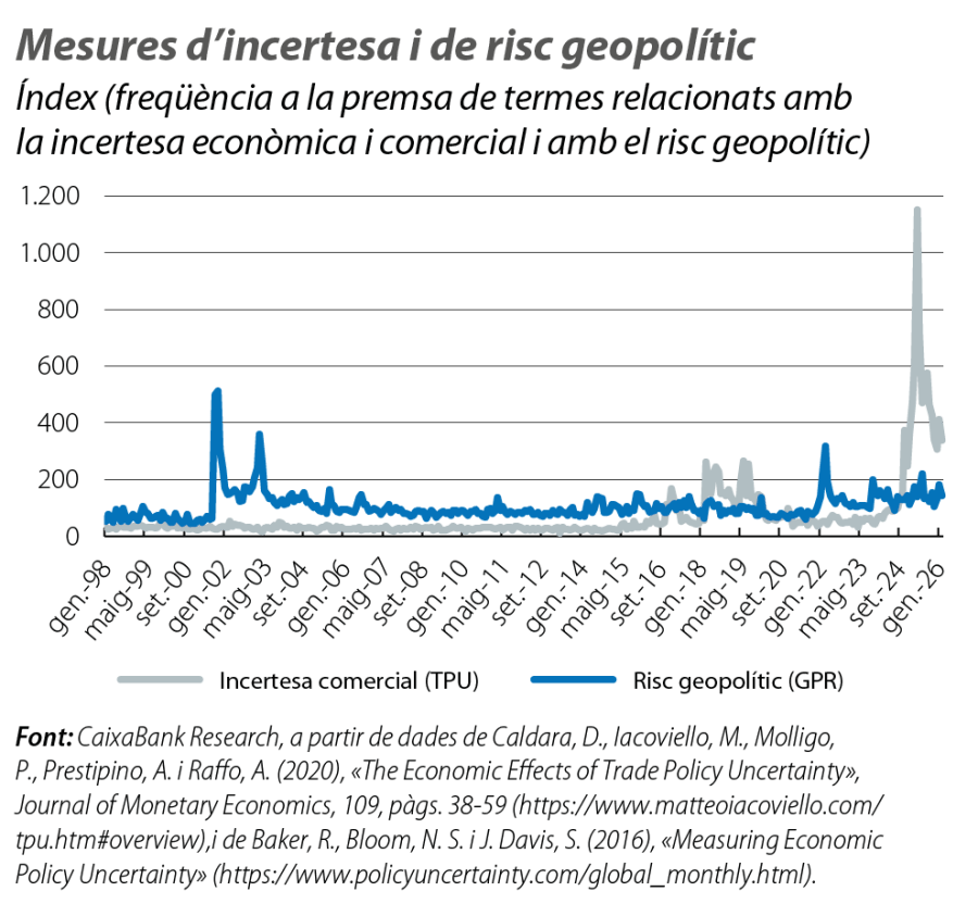 El conflicte a l’Iran s’afegeix als ja existents: Ucraïna, escàs marge fiscal a les economies industrialitzades i risc de correccions brusques als mercats financers per les elevades expectatives i per les valoracions vinculades amb les empreses relacionades amb la IA. Així mateix, s’ha de consignar com un risc important per a l’escenari la intensificació de la incertesa comercial després del revés del Tribunal Suprem a una bona part dels aranzels implementats per Trump (vegeu «10 preguntes sobre el dictamen aranzelari del Tribunal Suprem dels EUA», en aquest mateix Informe Mensual).