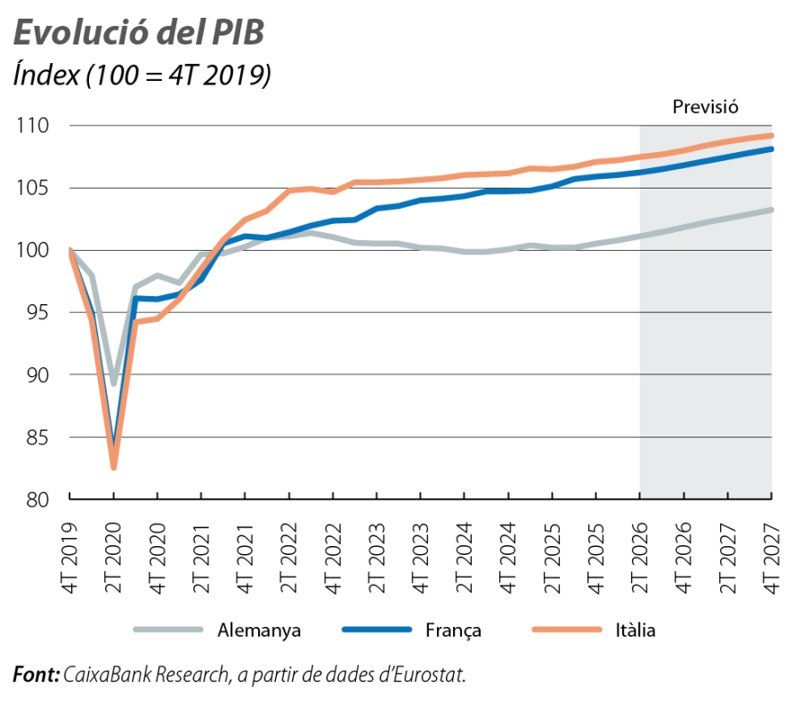 A Itàlia, el creixement es veurà limitat per un consum privat apàtic i per la falta d’impuls de la demanda externa. La inversió serà el principal motor, gràcies als fons NGEU encara disponibles abans del venciment del programa a l’agost. Les condicions financeres continuaran sent favorables, amb el suport d’una política fiscal de to neutre (el dèficit es retallaria en 0,2 p. p., fins al 2,8% del PIB). A més a més, és possible que Itàlia abandoni el Procediment per Dèficit Excessiu durant la primera meitat de l’any i que pugui activar la clàusula d’escapament, que permetria incrementar durant quatre anys la despesa en defensa fins a un màxim de l’1,5% del PIB anual. En conseqüència, el 2026, el creixement seria del 0,8% i podria superar l’1,0% el 2027.
