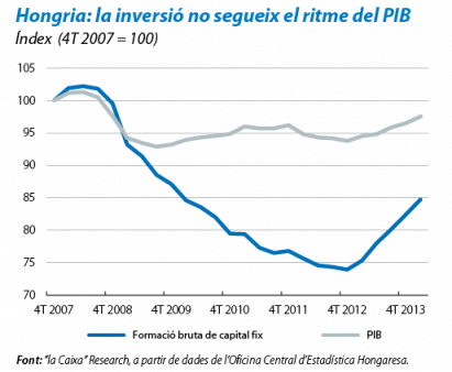 Després de caure l'1,7% el 2012, l'economia hongaresa va créixer l'1,2% el 2013. La recuperació de l'activitat ha prosseguit en el 1T d'enguany, moment en què el creixement es va situar en el 3,2% interanual, però aquesta xifra no s'ha d'extrapolar. Es preveu que el PIB avanci a taxes més contingudes en els pròxims trimestres, de manera que s'anirà materialitzant una suau expansió econòmica, amb el creixement situat a la zona del 2% el 2014 i el 2015. Aquesta trajectòria deixarà Hongria ressagada en relació amb els seus veïns regionals, els quals, progressivament, aniran mostrant més dinamisme. Si es compleixen les previsions, el 2015, la República Txeca creixerà el 2,5%; Eslovàquia i Romania, gairebé el 3%, i Polònia, el 3,5%. Què explica que la recuperació magiar, amb prou feines iniciada, es quedi ràpidament sense pols?