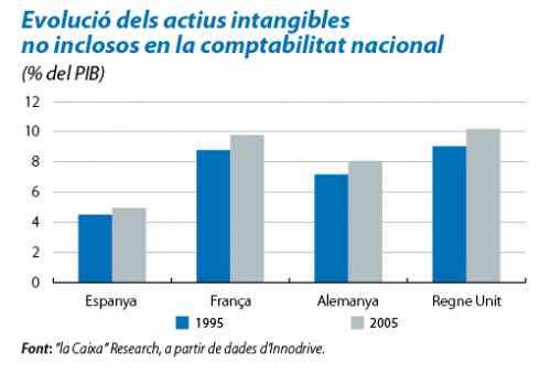 La inversió en aquests actius intangibles és significativa: el 2005, representava el 5,0% del PIB a Espanya i el 10,2% al Regne Unit. El pes d'aquests actius també va augmentar entre el 1995 i el 2005, tendència que, previsiblement, ha continuat. Finalment, cal apreciar que, malgrat que el rànquing de països que més inverteixen (com a percentatge del PIB) canvia en incloure aquests actius intangibles, les diferències entre països es redueixen. En definitiva, sembla raonable relativitzar el neguit per la disminució de la inversió, ja que, en part, aquest descens s'explica per l'augment del pes dels actius intangibles.