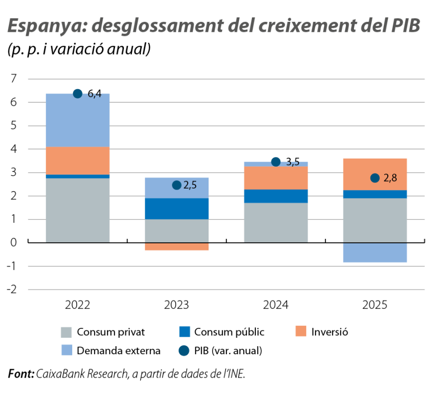 El 2025 va ser un bon any per a l’economia espanyola. Malgrat els desafiaments aranzelaris, el PIB va avançar un destacable 2,8%, gairebé el doble que l’1,5% del conjunt de la zona de l’euro. La composició del creixement va confirmar el viratge de les fonts de creixement. La demanda interna i, en especial, el consum privat i la inversió van ser els motors de l’expansió, mentre que la demanda externa neta va restar creixement per primera vegada en anys (vegeu el gràfic). Aquesta aportació negativa no implica una pèrdua de competitivitat –com ho expliquem al Focus «Les exportacions espanyoles davant els desafiaments per a la seva competitivitat», en aquest mateix Informe Mensual–, sinó que reflecteix l’avanç feble del nostre principal soci comercial, el gir proteccionista dels EUA i el fort augment de les importacions vinculades a la inversió i, en menor mesura, al consum.