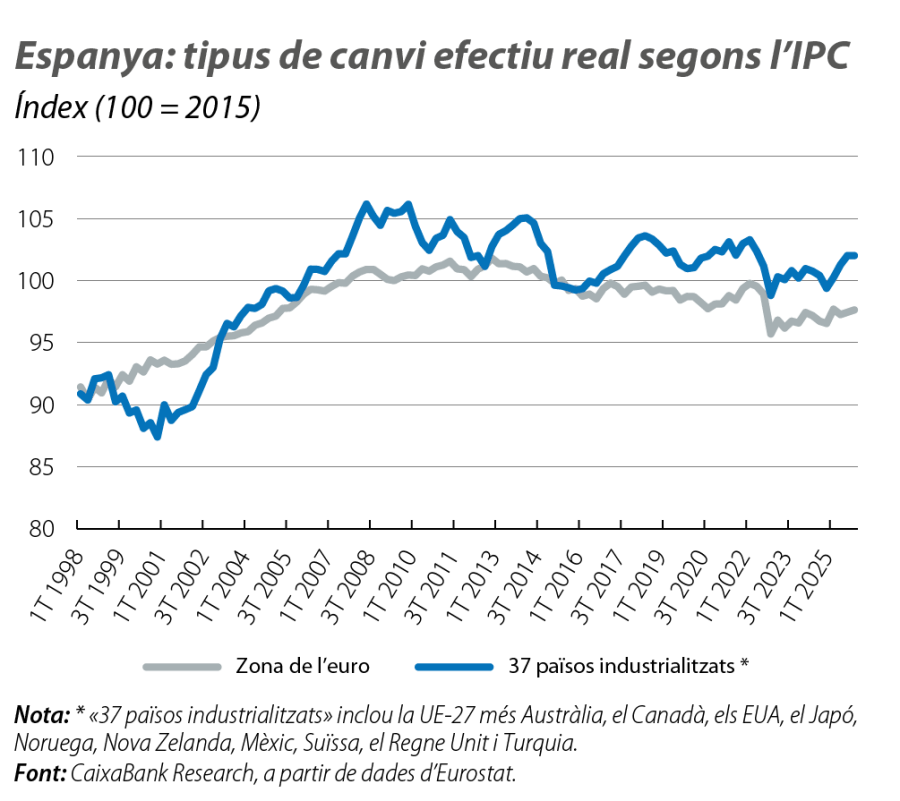 Per mesurar la competitivitat per preus, utilitzarem el tipus de canvi efectiu real (TCER), que mesura el tipus de canvi nominal d’Espanya fent la mitjana amb relació a un conjunt de socis comercials, ajustat per la inflació relativa segons l’IPC harmonitzat. L’ajust per la inflació captura les diferències de preus al consum entre Espanya i les seves contraparts. Per tant, si el TCER puja, significa que Espanya perd competitivitat, ja que les exportacions s’encareixen i les importacions s’abarateixen en termes relatius, i viceversa.