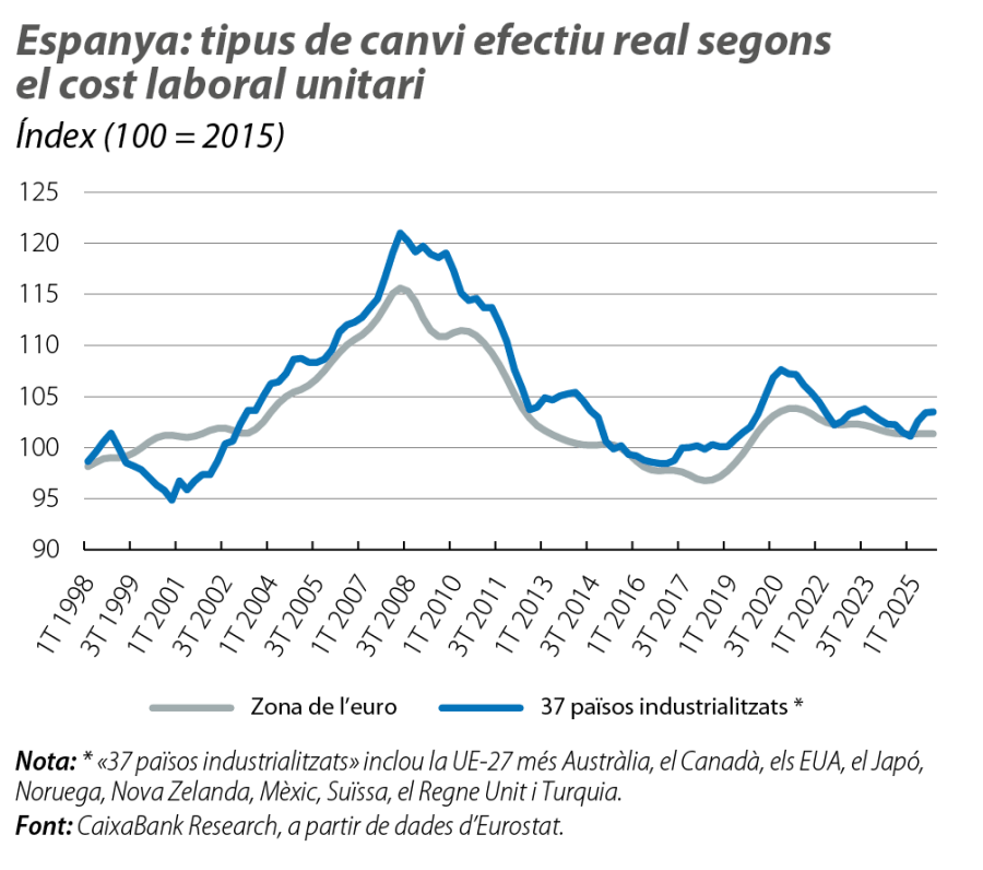 D’altra banda, també podem analitzar l’evolució del TCER deflactat per l’índex del cost laboral unitari (CLU) en lloc de la inflació. Aquest ens permet veure si, des del costat de la producció, existeix una pressió a través de la relació entre salaris i productivitat que pugui contribuir a l’encariment relatiu en relació amb altres països. Al segon gràfic, s’observa que, després d’un pic del TCER durant la COVID-19, a causa del fort repunt dels CLU, Espanya ha recuperat competitivitat de manera clara en relació amb els costos de la zona de l’euro, tot i que se situa en un posició pitjor que la del 2019. En relació amb el grup de 37 economies industrialitzades, la millora que es va produir el 2020 ha tendit a moderar-se, i, després d’un lleuger repunt el 2025, la posició actual és similar a la del 2019.