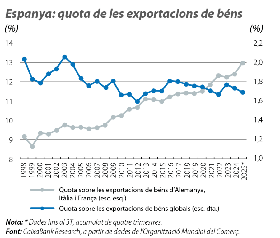 En conjunt, els indicadors analitzats suggereixen que, malgrat el diferencial inflacionista i l’apreciació de l’euro en els últims anys, no s’observa un deteriorament rellevant de la competitivitat exterior d’Espanya. Això, en combinació amb unes quotes d’exportació estables o a l’alça tant en béns com en serveis, fa pensar que l’economia espanyola ha aconseguit mantenir la seva posició competitiva en un entorn exigent. Aquest funcionament es podria associar a un esforç diversificador del nostre sector exportador, o a la capacitat de competir en altres dimensions, que hauria compensat de forma parcial l’impacte del major nivell de preus relatius. Tot plegat adquireix encara més rellevància en un entorn global en què la Xina continua ampliant el seu pes i en què diverses economies europees i fins i tot els EUA han cedit posicions.