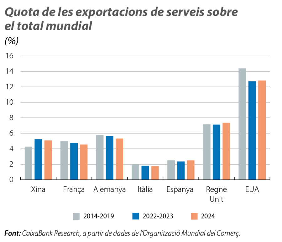 Pel que fa a la quota de les exportacions de serveis sobre el total mundial, Espanya recupera, en l’últim any, el nivell prepandèmia, un resultat especialment positiu si es compara amb els d’Alemanya, Itàlia i França, que perden quota. En paral·lel, els EUA, malgrat continuar sent els líders del sector, cedeixen una mica de terreny en el repartiment global, mentre que la Xina i el Regne Unit guanyen quota en els últims anys. Si analitzem els serveis turístics en particular, el funcionament d’Espanya és destacable. La nostra quota mundial se situa al voltant del 6%, per davant de França (al voltant del 4%), d’Itàlia (el 3,5%) i d’Alemanya (el 2,5%), i 1 p. p. per damunt del nivell registrat el 2019, de manera que Espanya es consolida com un dels principals exportadors de serveis turístics d’Europa. Si ens centrem només en els serveis no turístics, després de l’excepcional creixement del sector a partir del 2021, obtenim que Espanya ha sabut defensar la seva quota de mercat en un entorn en què Alemanya, Itàlia, França i els EUA han reculat, tot i que sense millorar-la, atès que el volum d’exportacions mundials també ha augmentat de forma intensa.