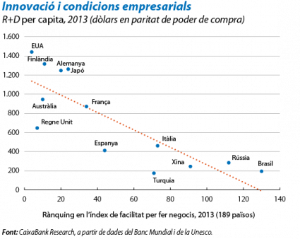 El primer pilar és essencial, ja que es tracta de crear un caldo de cultiu favorable per a l’emprenedoria i la innovació. Així, la millor manera de fomentar la innovació i l’R+D és mitjançant unes condicions propícies per desenvolupar noves idees i projectes: al gràfic, s’observa que, als països on hi ha un entorn favorable per a la iniciativa empresarial, mesurat per l’índex de facilitat per fer negocis elaborat pel Banc Mundial, la despesa en R+D per capita és superior. El més important és crear un marc regulador que garanteixi el compliment dels contractes, que agiliti els tràmits per crear negocis i que reforci la seguretat jurídica. A més a més, cal facilitar la integració de l’economia en el comerç global, perquè la nova indústria pugui treure el màxim partit de les cadenes de valor global.