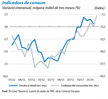El consum de les llars titubeja després de l'embranzida de les acaballes del 2013. Malgrat que, durant la segona meitat del 2013, el consum de les llars va sorprendre positivament, amb avanços del 0,5% intertrimestrals en el 3T i en el 4T, sembla que el ritme de creixement s'ha moderat en els primers compassos del 2014. Així ho suggereix l'evolució de les vendes al detall, que han frenat el ritme d'avanç fins al 0,3% interanual durant els dos primers mesos de l'any, enfront del 0,9% registrat entre els mesos de setembre i desembre del 2013. Aquest resultat contrasta amb l'evolució positiva de la confiança del consumidor, que, al març, va assolir màxims que no es registraven des del 2004. De fet, factors de fons com l'evolució del mercat laboral continuen sent favorables a la recuperació del consum de les llars, de manera que la desacceleració de les vendes al detall ha de ser interpretada com un fenomen temporal.