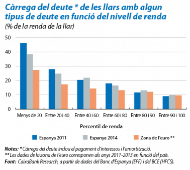 Una segona qüestió que cal analitzar és l’evolució de l’endeutament en funció del nivell d’ingressos de la llar.4 D’una banda, entre les llars amb ingressos mitjans (entre el percentil 20 i el 80), el percentatge de llars amb algun tipus de deute pendent es va reduir entre els anys 2011 i 2014. Aquesta situació contrasta amb l’evolució de l’endeutament de les llars de renda baixa (inferior al percentil 20): el percentatge de llars endeutades va augmentar del 20,8% del 2011 al 27,5% del 2014, i, a més a més, el valor mitjà del deute va passar de 18.900 euros a 24.500 euros per llar endeutada. No obstant això, per a aquest grup de llars amb menys renda i amb deute pendent, la càrrega del deute5 es va reduir de forma molt intensa, del 46,2% del 2011 al 38,5% del 2014, gràcies, en gran part, als tipus d’interès més baixos. De tota manera, aquest segment de la població encara ha d’afrontar una càrrega del deute molt elevada en comparació amb les llars europees endeutades en el mateix percentil de renda (el 27,5%).