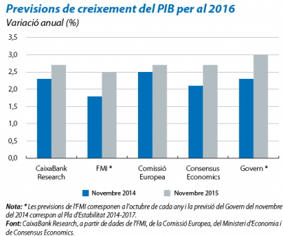 Les perspectives per al 2016 són favorables per a l'economia espanyola. Els pronòstics de la majoria d'organismes internacionals la situen al capdavant dels països europeus més grans, amb creixements previstos del PIB que oscil·len entre el 2,5% de l'FMI i el 3,0% del Govern. La nostra previsió, del 2,7%, es fonamenta en una demanda interna que continuarà sent el motor del creixement, però que perd una mica d'impuls, i una demanda externa que començarà a contribuir positivament al creixement. Tot i que aquesta xifra és una mica inferior a la que s'espera per al 2015, el 3,1% segons les nostres previsions, cal tenir en compte que els suports temporals, com la rebaixa fiscal o la caiguda del preu del petroli, han estat determinants per assolir el ritme d'avanç actual. El 2016, a mesura que l'impacte d'aquests suports es vagi esvaint, cal esperar la moderació de la velocitat de creixement. No obstant això, els elements de fons que sostenen un creixement més equilibrat a llarg termini aniran guanyant protagonisme. Així, després d'un any que, sense cap mena de dubte, ha estat excepcional en creixement i en creació d'ocupació, preveiem que el 2016 no serà tan bo en termes quantitatius, tot i que, en canvi, sí ho serà en termes qualitatius. Tot seguit, desgranem els elements que, segons les nostres previsions, donaran suport al creixement de l'economia espanyola l'any vinent.
