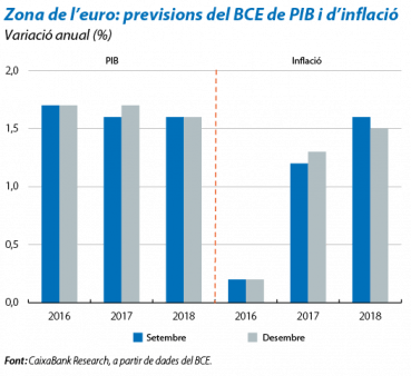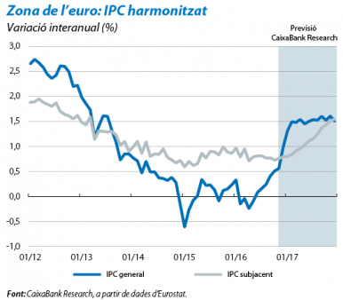 El creixement de l’activitat es consolida el 2017, però persisteixen els riscos. L’economia de la zona de l’euro es va expandir a ritme moderat però constant el 2016, malgrat els múltiples esdeveniments econòmics i polítics de l’any, i s’espera que, el 2017, mantingui un to molt similar. En concret, l’escenari de CaixaBank Research preveu que la regió hagi finalitzat el 2016 amb un creixement de l’1,7% i que avanci un moderat 1,5% el 2017. Així ho considera també el BCE, que, en l’actualització trimestral del quadre macroeconòmic, va augmentar lleugerament la previsió de creixement per al 2017 fins a l’1,7% (+0,1 p. p.) i va mantenir una lleugera desacceleració a mitjà termini (l’1,6% el 2018). Pel que fa a la inflació, el BCE va revisar lleugerament a l’alça la previsió per al 2017, fins a l’1,3% (+0,1 p. p.), a causa de la revisió a l’alça en la previsió del preu del petroli per a aquest any. No obstant això, la institució monetària espera una recuperació molt gradual de les pressions inflacionistes a mitjà termini, amb uns registres que considera que no s’aproparan prou al seu objectiu el 2018 i el 2019. Així mateix, el BCE alerta dels elevats riscos que envolten l’escenari de previsions, tant dels procedents de l’exterior com dels relacionats amb la situació política de la zona de l’euro, com l’inici de la negociació de la sortida del Regne Unit de la UE i les importants cites electorals previstes a Alemanya, a França i, potser també, a Itàlia. Tot plegat fa convenient continuar amb un entorn monetari molt acomodatici.