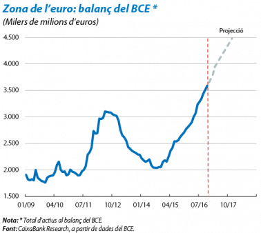 El BCE prorroga el programa de compra de bons fins al desembre del 2017 i assegura que la política monetària continuarà sent molt acomodatícia a mitjà termini. Malgrat que el volum de compres d’actius baixarà a 60.000 milions d’euros mensuals a partir de l’abril (80.000 milions actualment), el BCE va emfatitzar que continua considerant necessari mantenir unes condicions financeres molt laxes per donar suport a la recuperació de l’activitat econòmica a la zona de l’euro, peça clau perquè la inflació s’acosti a l’objectiu del BCE. Una mostra de la gran transcendència de les mesures que pren el BCE és que la dimensió del seu balanç està previst que se situï en els 4,5 bilions d’euros al final del 2017, el doble que a començament del QE al març del 2015. Així mateix, Mario Draghi va assenyalar que la inflació no assolirà l’objectiu del BCE en els tres propers anys, la qual cosa fa pensar que el BCE continuarà mantenint una política monetària molt laxa més enllà del desembre del 2017. A més a més, va assenyalar que hi continua havent importants riscos a la baixa i que, si és necessari, tornarà a augmentar el volum de compres. D’acord amb aquests missatges, tant l’escenari de previsions de CaixaBank Research com el del conjunt d’analistes consideren que el BCE no apujarà el tipus de referència fins a mitjan 2019.