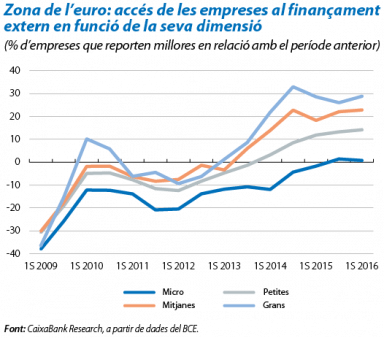 En aquest context de tipus baixos, la demanda de crèdit es va recuperant de forma gradual. La política monetària del BCE ha aconseguit que els tipus d’interès arribin a mínims històrics, amb l’objectiu d’impulsar el crèdit i l’activitat econòmica. Segons l’enquesta que elabora el BCE, les condicions d’accés al finançament per part de les pimes han millorat de forma notable en els últims trimestres. Així, les empreses apunten que va augmentar tant la disponibilitat de crèdit bancari com la voluntat dels bancs de proveir crèdit a uns tipus d’interès més baixos. En aquesta enquesta, també s’observa que, gràcies a la millora de les condicions de finançament, les empreses ja no consideren que l’accés al crèdit sigui un dels seus problemes principals. Ara poden centrar les energies a afrontar altres reptes més propis del seu negoci, com aconseguir clients o reduir els costos de producció.