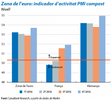 La majoria d’indicadors d’activitat apunten a una acceleració del creixement en el 4T. L’índex de producció industrial de la zona de l’euro va créixer l’1,5% interanual a l’octubre (mitjana de tres mesos), un avanç clarament superior al del primer semestre de l’any. Per la seva banda, tant l’índex PMI compost com l’índex de sentiment econòmic de la zona de l’euro van assolir màxims anuals en el 4T i es van situar en zona clarament expansiva. Per països, l’acceleració continua liderada per Alemanya, amb un PMI compost que va assolir els 55,0 punts i un sentiment econòmic que es va situar en els 108,0 punts (mitjana de l’octubre i novembre). També van destacar els bons registres de França, que apunten a un creixement econòmic una mica superior al del 4T (un avanç del PIB del 0,4% intertrimestral, per damunt del 0,2% del 3T). Al novembre, el sentiment econòmic només es va deteriorar a Itàlia, arran del clima d’incertesa política propiciat pel referèndum sobre la reforma de la Constitució i de la feble situació d’algunes entitats bancàries. Als dos fronts s’ha fet un pas endavant durant el mes de desembre: el relleu al capdavant del Govern va ser ràpid i sense tensions i el nou Govern italià va assolir un acord amb la Comissió Europea per ajudar les entitats més febles amb fons públics. De tota manera, el nou Govern liderat per P. Gentiloni és provisional, fins que es convoquin noves eleccions, probablement al final del 2017, i el procés de sanejament de la banca italiana serà lent. Tot plegat fa que el país transalpí sigui percebut, de cara al 2017, com un dels principals focus de risc.