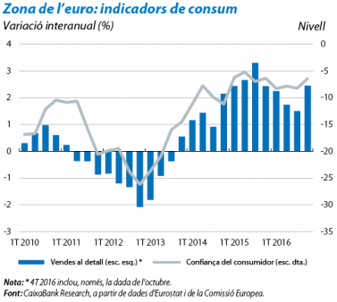 La solidesa de la demanda interna s’observa en els indicadors de consum. Les vendes al detall van augmentar el 2,5% interanual a l’octubre, per damunt del creixement experimentat en el 3T 2016 (l’1,5%). Aquest avanç continua situant el consum privat com un dels principals suports de la recuperació econòmica de la zona de l’euro. Per la seva banda, l’índex de confiança del consumidor per al conjunt de la zona de l’euro va augmentar de forma considerable al desembre, fins a situar-se en els –5,1 punts, el millor nivell dels 20 últims mesos. Per a l’any vinent, esperem que el consum de les llars es continuï expandint, amb el suport de la millora del mercat laboral i dels baixos tipus d’interès, i que contribueixi a l’avanç de la inflació.
