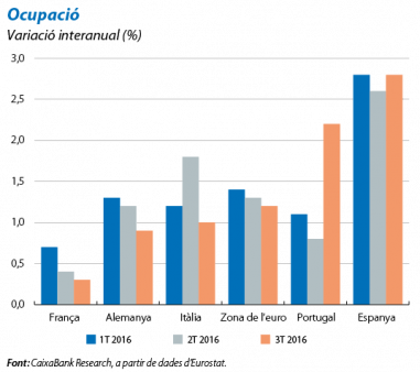 La millora del mercat laboral es consolida i contribueix a l’augment del consum de les llars. Així, al conjunt de la zona de l’euro, l’ocupació va créixer el 0,2% intertrimestral en el 3T 2016 (el 0,4% en el 2T), la qual cosa va permetre assolir el nombre d’empleats que hi havia abans de la recessió econòmica (153,4 milions d’empleats). Per països, destaca en positiu el creixement de l’ocupació observat a Portugal (l’1,3%), a Espanya (el 0,8%) i a Irlanda (el 0,6%), que contrasta amb el menor augment a Alemanya i a França (+0,1% intertrimestral) i amb la disminució a Itàlia (–0,1%). Pel que fa als costos laborals, van augmentar l’1,6% interanual en el 3T 2016, una mica per damunt de la mitjana del primer semestre. Aquest augment és degut, en gran part, al repunt dels costos salarials a Alemanya, del 2,4% interanual, 4 dècimes per damunt de l’increment del primer semestre.