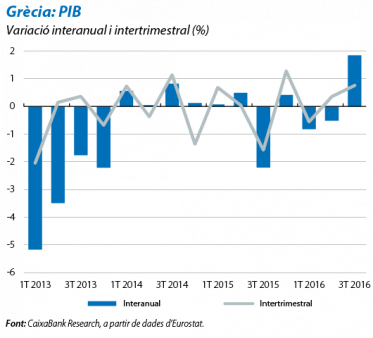 Grècia continua amb taxes de creixement positives, però encara hi ha feina per fer. L’economia grega va presentar un notable ritme d’avanç en el 3T, amb un creixement intertrimestral del 0,8%. De tota manera, l’evolució de l’activitat econòmica ha estat molt erràtica en els últims anys, i la recuperació econòmica encara es mostra molt fràgil. Un dels temes que continua qüestionant la sostenibilitat de la recuperació és l’elevat nivell de deute públic. En aquest sentit, l’Eurogrup s’ha mostrat obert a adoptar mesures d’alleujament del deute. No obstant això, l’anunci del Govern de Tsipras d’augmentar la despesa pública sense haver-ho consensuat prèviament amb l’Eurogrup ha tornat a tensar la relació entre les dues parts. El serial grec no s’ha acabat.