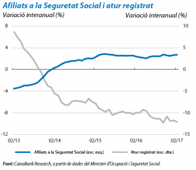 El major creixement del PIB es trasllada al mercat laboral. D’acord amb les bones dades d’activitat, la informació referent al mercat laboral també ha estat molt positiva. En particular, el nombre d’afiliats a la Seguretat Social va augmentar en 46.079 persones al febrer en termes desestacionalitzats, un registre similar al dels dos anys anteriors. Amb aquesta dada, el ritme de creació d’ocupació es va accelerar fins al 3,4% interanual. Així mateix, també cal destacar que la millora va ser generalitzada a la majoria de sectors d’activitat. L’atur registrat, per la seva banda, es va reduir en 32.711 persones, també en termes desestacionalitzats. El ritme de descens de l’atur registrat va augmentar en 3 dècimes, fins al –9,7% interanual. La bona marxa del mercat laboral en els dos primers mesos de l’any i la millora de les perspectives de creixement del PIB ens empenyen a millorar també les previsions de creixement de l’ocupació el 2017 fins al 2,2%, percentatge que correspon a una creació, de mitjana, de més de 400.000 nous llocs de treball.