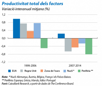 Començant per l'anàlisi de la productivitat, definida aquí com la productivitat total dels factors (PTF),2 el seu escàs creixement és un problema per al conjunt de la zona de l'euro, però, en especial, per a la perifèria, regió que ha registrat una persistent disminució d'aquesta variable (en el període 1999-2014, el creixement mitjà de la PTF a la perifèria ha estat del –0,7%). No obstant això, el nucli no està exempt de dificultats, ja que, des del 2007, també experimenta un deteriorament productiu, tot i que menys intens (vegeu el primer gràfic).